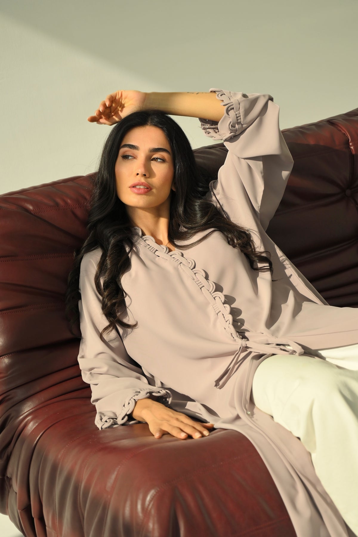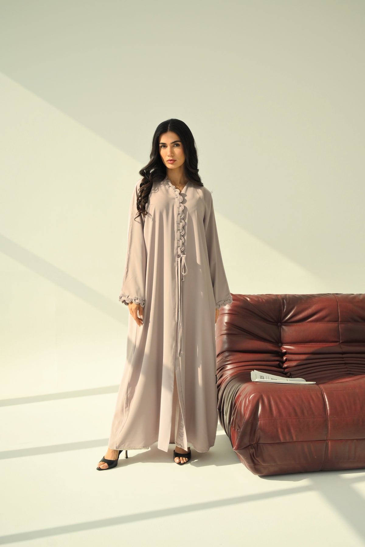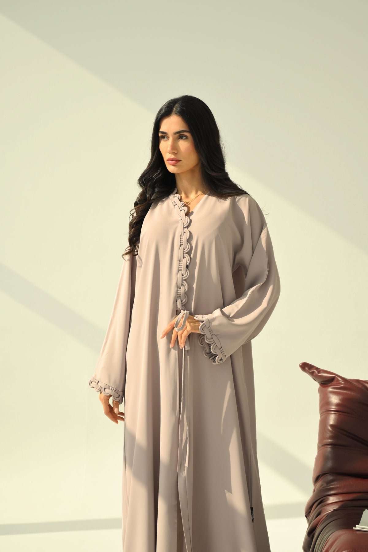 Een elegante abaya met een mooie gevlochten detail aan de voorkant en bij de armen. De abaya heeft een vallende stof.